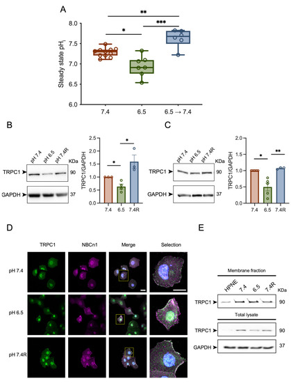 TRPC1 protein expression is affected by acid adaptation and recovery and favors the plasma membrane localization. (A) Steady state pHi in PANC-1 cells grown in normal pH or acid adaptation conditions and measured in HCO3− Ringer adjusted to pH 7.4 or 6.5 (X-axis). 6.5 → 7.4 indicate acid-adapted cells measured in pHe 7.4. (n = 6–11). (B) Western blot analysis (left panel) and quantification (right panel) of TRPC1 expression in PANC-1 cells grown under normal pH (7.4), acid adaptation (6.5) or acid recovery conditions (7.4R) (n = 3–4). (C) Western blot analysis (left panel) and quantification (right panel) of TRPC1 expression in PANC-1 spheroids grown under normal pH (7.4), acid adaptation (6.5), or acid recovery conditions (7.4R) for 9 days (n = 3–5). Welch’s correction t-test was used to determine the significant difference between different conditions. *, ** and *** indicate p < 0.05 and 0.01 and 0.001 respectively. (D) Representative immunofluorescent analysis of TRPC1 and the membrane protein Na+/HCO3− co-transporter (NBCn1, used as membrane marker) in PANC-1 cells grown under normal pH (7.4), acid adaptation (6.5) or acid recovery conditions (7.4R) (n = 3), scale bars = 20 µm. (E) Cell surface biotinylation followed by Western blotting indicating membrane fraction or total lysate of TRPC1. The uncropped blots are shown in File S1.