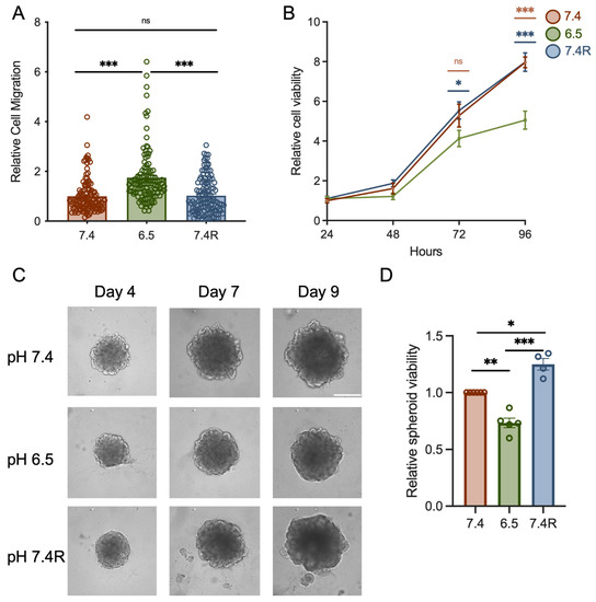 It is well known that the acidic tumor microenvironment can promote migration and slow down the proliferation of cancer cells [8,41,48,49]. First, we investigated the effect of pH on cell migration and viability. As expected, we found that acid-adapted PANC-1 cells migrated more than cells grown in normal pH and acid recovery conditions (75 ± 11.4 %, n = 3, p < 0.001, Figure 2A), and showed a significant decrease in viability (25 ± 10.7% and 36 ± 6.3% for 72 h and 96 h of cell culture, respectively) when compared to cells cultured in pH 7.4 (n = 3, p < 0.05, Figure 2B). Similar results were found in PANC-1 spheroids (n = 4, p < 0.01, Figure 2C,D). Indeed, acid-adapted PANC-1 spheroids grown for 9 days displayed lower viability by 25 ± 4% and by 43 ± 4.8% compared to normal pH and recovery conditions, respectively (n = 4–5, p < 0.01, Figure 2C,D).
