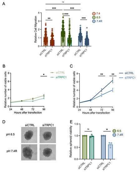TRPC1 silencing inhibits cell migration, proliferation, and the growth of PANC-1 spheroids under acid recovery conditions. (A) Cell migration of siTRPC1 cells grown under normal pH (7.4), acid adaptation (6.5), or acid recovery conditions (7.4R) analyzed by Boyden chamber assay (n = 3–4). Tukey’s multiple comparison test was used to determine significant differences between conditions. (B) Trypan blue analysis of siTRPC1 PANC-1 cells grown under acid adaptation (6.5), or (C) acid recovery conditions (7.4R), showing the relative number of viable cells 24, 48, 72, and 96 h post-transfection (n = 3–5). (D) Representative images of siTRPC1 transfected PANC-1 spheroids grown for 9 days, and (E) viability quantification performed with CellTiter-Glo® assay of siTRPC1 transfected spheroids grown under acid adaptation (6.5) or acid recovery (7.4R) (n = 3), scale bar = 400 µm. Welch’s correction t-test was used to determine the significant difference between siCTRL and siTRPC1 conditions. ns indicates non-significance. *, **, and *** indicate p < 0.05, 0.01, and 0.001, respectively.