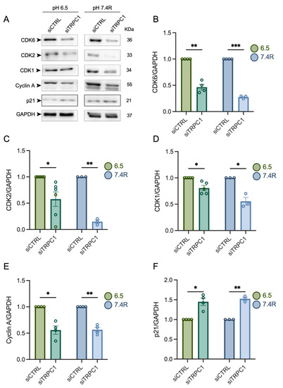 TRPC1 silencing decreases the expression of CDK6, -1, -2, and cyclin A and increases the expression of p21CIP1 to a greater extent in acid recovery conditions. (A) Western blot analysis of relevant cyclin-dependent kinase complexes and cyclins and their inhibitor p21CIP1 from cells grown under acid adaptation (6.5) or acid recovery conditions (7.4R). (B) Quantification of Western blot analysis representing the expression of CDK6, (C) CDK2, (D) CDK1, (E) cyclin A, and (F) p21CIP1 in siTRPC1 lysates compared to siCTRL lysates from PANC-1 cells grown under acid adaptation (6.5) or acid recovery (7.4R) conditions (n = 3 − 6). Welch’s correction t-test was used to determine the significant difference between siCTRL and siTRPC1. *, **, and *** indicate p < 0.05, 0.01, and 0.001, respectively. The uncropped blots are shown in File S1.