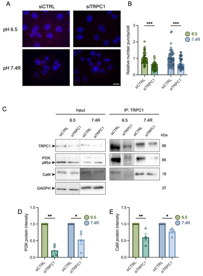 The PI3K signaling cascade is a regulator of cell cycle progression, as it activates transcription of cell cycle regulating proteins [50]. TRPC1 has been shown to be involved in activating the PI3K signaling pathway [30,33,51], and we have recently demonstrated that TRPC1 formed a complex with the PI3K p85α subunit and its associated connecting protein CaM, thereby regulating PANC-1 cell proliferation under normal pH conditions [37]. Thus, we aimed to investigate the role of the acidic tumor microenvironment and TRPC1 in association with PI3K signaling. Through confocal imaging, we found that TRPC1 also co-localized with the PI3K p85α subunit in acid-adapted PANC-1 cells, and that this was maintained under acid recovery conditions (Figure 6A). This co-localization was illustrated by the calculation of Mander’s overlapping R coefficient, which was 0.13, 0.58, and 0.48 in normal pH, acid adaptation, and acid recovery conditions, respectively (Figure 6A). We further investigated the protein interaction between the PI3K p85α subunit and TRPC1. With PLA analysis, we found an increase in the proximity between the PI3K p85α subunit and TRPC1 in acid-adapted cells by 43.8 ± 5.6% and by 28 ± 7.2% in acid-recovered cells, compared to cells grown under normal pH conditions, respectively (n = 3, p < 0.01 and 0.001, Figure 6B,C). The proximity was decreased by 21 ± 6.7% in acid-recovered cells compared to acid-adapted cells (n = 3, p < 0.01, Figure 6B,C). The protein–protein interaction was then confirmed by co-IP analysis, where we found similar results with the pull-down of both TRPC1 and PI3K p85α (Figure 6D). In addition, we investigated the interaction between CaM and TRPC1. Indeed, CaM can function as a connecting protein between TRPC1 and the p85α subunit of PI3K [51]. We found that CaM interacted with TRPC1 and the PI3K p85α subunit in all three pH conditions (Figure 6D). To strengthen the indication of a complex between TRPC1, PI3K, and CaM, we first performed PLA analysis on PANC-1 cells upon the silencing of TRPC1. We observed that the protein interaction between the PI3K p85α subunit and TRPC1 was decreased by 50.7 ± 6.2% and 34.2 ± 8.0% under acid adaptation and recovery conditions, respectively (n = 3, p < 0.001, Figure 7A,B). Next, we determined the protein–protein interaction upon the KD of TRPC1 by co-IP. Compared to siCTRL conditions, the interaction between TRPC1 and the PI3K p85α subunit was significantly decreased in siTRPC1 conditions by 79.8 ± 8.5% and 47.2 ± 14.5% in acid-adapted and -recovered cells, respectively (n = 4, p < 0.05 and 0.01, Figure 7C,D). Furthermore, a significant decrease in protein–protein interaction by 40.3 ± 10.8% and 23.0 ± 6.0% was observed between TRPC1 and CaM in acid-adapted and -recovered cells, respectively (n = 4, p < 0.05 and 0.01, Figure 7C,E). Collectively, these results indicate that TRPC1 interacts strongly with the PI3K p85α subunit under acidic and recovery conditions, probably in assembly with CaM.
