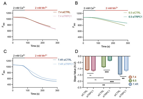 TRPC1 reduces basal Ca2+ entry in acid adaptation and recovery conditions. (A) Representative traces of Mn2+ quenching in transfected PANC-1 cells grown in normal pH conditions (7.4), (B) in acid adaptation (6.5) conditions, or (C) in acid recovery conditions (7.4R). (D) Quantification of siCTRL and siTRPC1 transfected PANC-1 cells in all three conditions (number of analyzed cells; pH 7.4 siCTRL n = 150 and siTRPC n = 128, pH 6.5 siCTRL n = 405 and siTRPC n = 326, pH 7.4R siCTRL n = 325 and siTRPC n = 214). Tukey’s multiple comparison test was used to determine significant differences between conditions. ns indicates non-significance. ** and *** indicate p < 0.01 and 0.001, respectively.