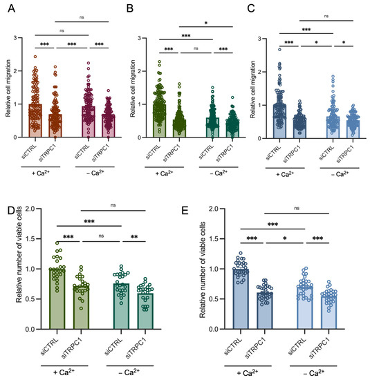 Given the ability of TRPC1 to regulate basal Ca2+ entry in acid-adapted and -recovered cells, and to understand whether Ca2+ is involved in cell migration and proliferation, we cultured cells in normal and low Ca2+ (30 µM free Ca2+) medium. Cell migration decreased by 40 ± 3.7% and 34.2 ± 5.6% in acid-adapted and -recovered cells, respectively, in the low Ca2+ medium (n = 3 and 4, p < 0.001, Figure 10B,C). KD of TRPC1 in this condition reduced migration additionally by 15.2 ± 4.7% and 12.5 ± 6.3% in acid-adapted and -recovered cells, respectively (n = 3 and 4, p < 0.001 and < 0.05, Figure 10B,C). Furthermore, no significant difference was found between the cell migration of siTRPC1 cells in normal Ca2+ medium and in siCTRL cells in low Ca2+ medium, indicating that TRPC1 mainly regulates PANC-1 cell migration in a Ca2+-dependent manner in acid adaptation conditions (n = 3, Figure 10B). In normal pH conditions, low Ca2+ medium failed to affect cell migration, and silencing of TRPC1 reduced it to a similar extent with or without extracellular Ca2+ (27.1 ± 4.7% and 30.4 ± 5.9, respectively; n = 3, p < 0.001, Figure 10A).