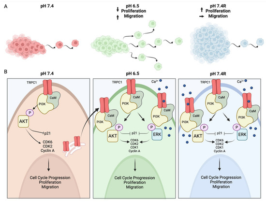 (A) Acid adaptation promotes migration but attenuates proliferation, whereas acid recovery impairs this migration but further accelerates proliferation. (B) The fluctuations in the acidic tumor microenvironment affect TRPC1 expression and localization. TRPC1 is downregulated in acid-adapted PANC-1 cells and favors plasma membrane localization, which is maintained in acid-recovered PANC-1 cells, where the expression of TRPC1 is upregulated. In the plasma membrane of acid-adapted and -recovered cells, TRPC1 permits Ca2+ entry and, in interactions with the PI3K p85α subunit and CaM, regulates PANC-1 cell migration, proliferation, and cell cycle progression. The figure is generated with www.Biorender.com.