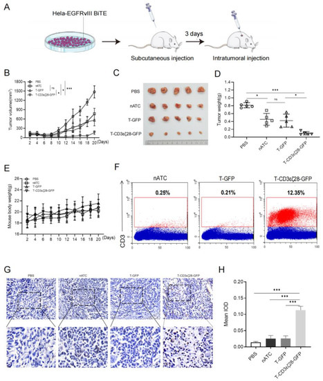 3.3. T-CD3εζ28-GFP Cells Showed Enhanced Anti-Tumor Activity in HeLa-EGFRvIII-BiTE Xenograft Tumor Model