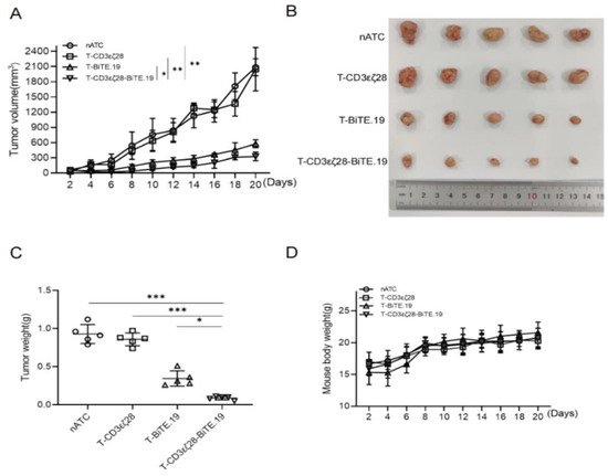 3.6. T-CD3εζ28-BiTE.19 Cells Showed Enhanced Anti-Tumor Activity in Xenograft Tumor Model
