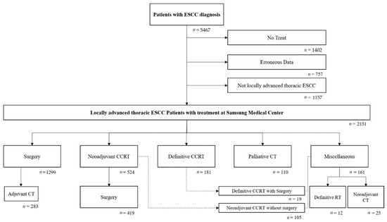 The inclusion criteria were as follows: age of 18 years and older and a diagnosis of esophageal ESCC between November 1994 and December 2018. The following were the exclusion criteria: (1) no administration of any anticancer treatment at the study site after diagnosis; (2) lack of availability of CDW information necessary for data analysis; and (3) failure to meet the diagnostic criteria for locally advanced esophageal cancer, defined as clinical T3/4 or N1–3 staging or as receipt of neoadjuvant CRT before surgery.