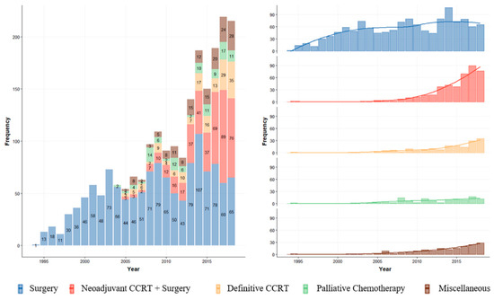 The number of patients treated for locally advanced ESCC increased over time. From 1994 to 2002, 261 patients were treated; most patients received upfront surgery. From 2003 to 2012, the number of patients treated increased to 790, and the number of multimodality treatments also increased after 2003. Notably, after 2013, 1100 patients were treated, and the proportion of treatment with NCRT greatly increased up to more than 50% of surgical cases for locally advanced ESCC. The practice patterns for each year are illustrated in Figure 2.