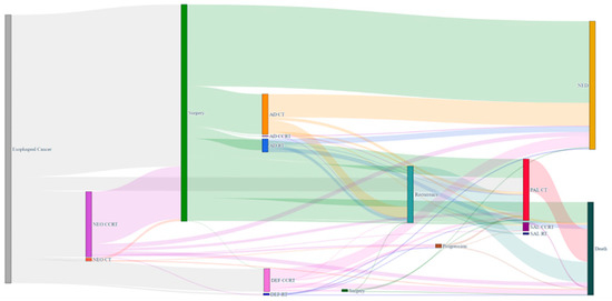 Sankey diagram for visualization of treatment and outcome patterns for 2 years after diagnosis of patients with locally advanced esophageal cancer. The thickness of the line in the figure shows how many patients belonged to each specific treatment.