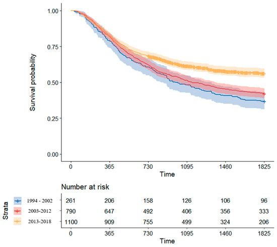 From 1994 to 2002, the 5-year OS of patients treated for locally advanced ESCC was 36.8% (95% confidence interval (CI), 31.4–43.1%). From 2003 to 2012, the 5-year OS rate was improved to 42.2% (95% CI, 38.8–45.7%). Notably, after 2013, when the use of NCRT for advanced ESCC became routine, the 5-year OS rate was much improved to 56.3% (95% CI, 53.2–59.6%). Kaplan–Meier survival curves for patients treated according to the period are shown in Figure 4.