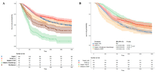We also analyzed survival outcomes in patients who underwent treatment with curative intent considering the effect of adjuvant chemotherapy (Figure 5B). Patients who received adjuvant chemotherapy following upfront surgery had better 5-year OS than those treated with surgery alone (58.4% (52.7–64.7%) vs. 47.3% (44.1–50.7%)). Surgery with adjuvant chemotherapy significantly reduced the risk of death in comparison with surgery only (HR 0.69; 95% CI, 0.56–0.85; p < 0.001) Furthermore, patients who underwent upfront surgery with adjuvant chemotherapy had comparable outcomes to patients who underwent NCRT+S (58.4% (52.7–64.7%) vs. 58.1% (53–63.7%)). There was no difference in survival outcome between NCRT+S and surgery with adjuvant chemotherapy (p = 0.597). Detailed survival outcomes by treatment are described in Table 2.