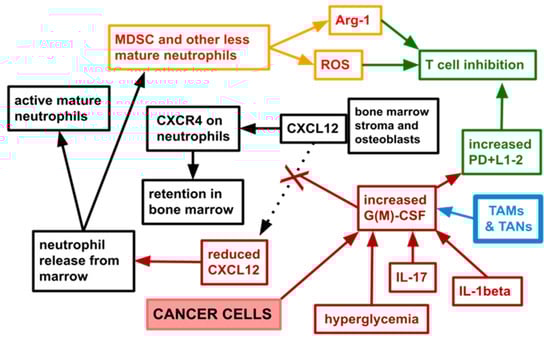 Common metastasizing cancers tend to be whole body diseases. Abnormal and pathophysiologically relevant bone marrow or spleen hematopoiesis is driven in cancer in part by tumor-synthesized G(M)-CSF [,,,,,,]. The net tendency of excess G(M)-CSF, whether malignant tissue produced or exogenous as a pharmacological agent, is to hasten transit time through the stages of granulopoiesis, resulting in increased neutrophil release, but also release of less mature neutrophils which are thought to comprise the MDSC subset. Retention in marrow is the result of many factors or retention axises, several of which are disrupted by G(M)-CSF [,]. Two of these retention pathways are diagrammed in Figure 1.