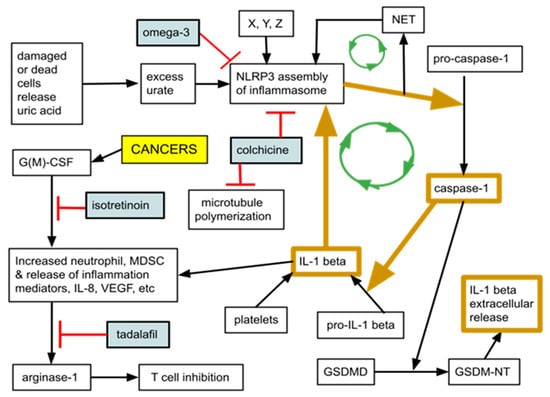 Simplified overview of several of the interacting neutrophil related inflammation systems that in health is crucial in fighting infection but in cancer facilitates malignant growth. Locus of action is also depicted for the TICO drugs tadalafil, isotretinoin, colchicine and omega-3. Intermediate steps are omitted from this schematic, f. ex. isotretinoin probably affects IL-1 beta by suppressing transcription of its mRNA. X, Y, Z refers to a variety of stimuli, including infection, tissue damage, increasing ROS, microbial components, lysosomal rupture, mtDNA, particulate matter, and metabolic dysregulation; GSDMD, gasdermin; MDSC are myeloid derived suppressor cells, a less than fully mature neutrophil subset with normal, mature morphology on H&E. Important but not shown in this schematic, is caspase-1 mediated conversion of pro-IL-18 to active IL-18. Note potential amplification feedback loops between NETs, IL-1beta and the NLRP3 inflammasome. Not shown are multiple inhibiting factors at each step.