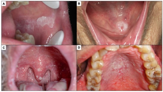 Pseudomembranous candidiasis is a fungal infection, usually Candida albicans, which manifests as white lumpy lesions resembling milk or yoghurt clots, which spread widely on the oral mucosa, especially along the hard and soft palate (Figure 2C). It is an opportunistic infection that appears in critically ill, immunocompromised patients, dehydrated or elderly patients, all circumstances that should be reflected in the patient’s clinical history or investigated by the clinician, helping to suspect the diagnosis. However, the most common clinical feature distinguishing pseudomembranous candidiasis from oral leukoplakia is that the former detaches when the lesion is scraped off with gauze; therefore, all white lesions of the oral mucosa should be scraped off as part of the diagnostic strategy (oral leukoplakias never detach on scraping).