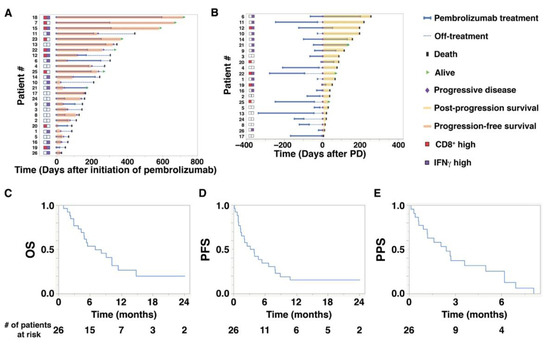 Overall survival (OS), progression-free survival (PFS), and post-progression survival (PPS) of aUC patients treated with pembrolizumab. (A) A swimmer plot illustrates OS and PFS (orange bars) of 26 patients who received pembrolizumab treatment. The status of CD8+ T cells (red squares) and interferon gamma (IFNγ) expression (purple squares) is indicated on the left. (B) A swimmer plot illustrates PPS (yellow bars) of 22 patients who eventually developed progressive disease (PD) during or after pembrolizumab treatment. The horizontal axis shows the number of days after the initiation of PD. (C–E) Kaplan–Meier plots for (C) OS, (D) PFS, and (E) PPS of 26 patients who received pembrolizumab treatment.