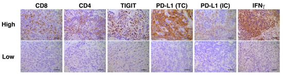 Our quantitative evaluation protocol was as follows: CD8+, CD4+, and TIGIT+ TIL densities were defined as the percentage of the total number of immune-shaped cells present within the tumor. A density of CD8+ and CD4+ TILs at <20% was considered to be low, whereas ≥20% was considered high infiltration, as previously reported [22]. For TIGIT+ TILs, a density < the median was considered low infiltration, and a density ≥ the median was considered a high infiltrate.