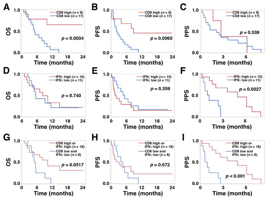 Kaplan–Meier plots displaying overall survival (OS), progression-free survival (PFS), and post-progression survival (PPS) for the 26 study patients with regard to high and low levels of (A–C) CD8+ T cells, (D–F) IFNγ, and (G–I) the combination of CD8+ T cells and IFNγ.