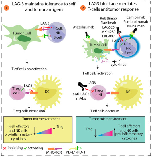 LAG3/MHC Class II Signaling Pathway. (1) LAG-3 is commonly expressed on regulatory T cells (Treg), effector T cells, and NK cells. Its main ligand is MHC class II, which is found upregulated on some tumor cells, tumor-infiltrating macrophages, and dendritic cells (DCs). LAG-3-MHC II interaction promotes inhibition of the responses of effector T cells and promotes the suppressive activity of Treg. (2) Double blocking of LAG3 and PD1 in synergy using antagonist antibodies against LAG3 in combination with PD-1/PD-L1 blockade, represents a novel strategy in oncology. Indeed, co-blocking LAG-3 and PD-1 enhances T-cell effectors and NK cells proliferation, promotes the release of pro-inflammatory cytokine, and inhibits Treg cells [21].