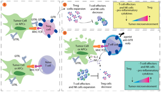 Model for GITR modulation of antitumor immunity. (1) GITR ligand (GITRL) is mainly expressed on tumor cells or antigen presenting cells (APCs). High levels of GITR are normally expressed on regulatory T cells (Treg). In contrast, on effector T cells, GITR expression is upregulated following activation by TCR-MCH interaction. (2) GITR engagement on Treg cells promotes Treg cells activation and proliferation and inhibits proliferation of effector T and NK cells. (3) Conversely, GITR-GITRL interaction on effector T cells promotes antitumor activity of T cells by enhancing CD4+ and CD8+ T-cell proliferation and downregulates the immunosuppressive activity of Tregs. Activation of effector T cells can also be stimulated using agonists anti-GITR, such as BMS-986156 or TRX518.