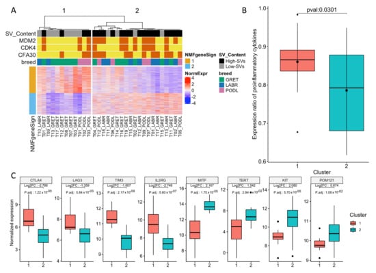 Transcriptomic analysis of 32 canine MM samples. (A) NMF clustering of expression data identified two subgroups that overlap with SV content. The first subgroup is characterized by the expression of immune response and cytokine-mediated signaling pathways and a low SV content, whereas the second subgroup is characterized by the expression of melanin metabolic processes and pigmentation pathways and is enriched in SV as well as focal amplifications of MDM2, CDK4, or CFA30:17Mb region. (B) Expression ratio of proinflammatory cytokines (IFN-γ, IL-1A, IL-1B, and IL-2) and immunosuppressive molecules (IL-10, IL-11, and TGFB1) significantly differs between the two groups (p = 0.03, Student test). (C) Expression of immune checkpoint genes or known oncogenes according to the transcriptomic classification. The following immune checkpoint genes CTLA4, LAG3, TIM3, and IL2RG are overexpressed in group 1, while the oncogenes MITF, TERT, KIT, and POM121 are overexpressed in group 2.