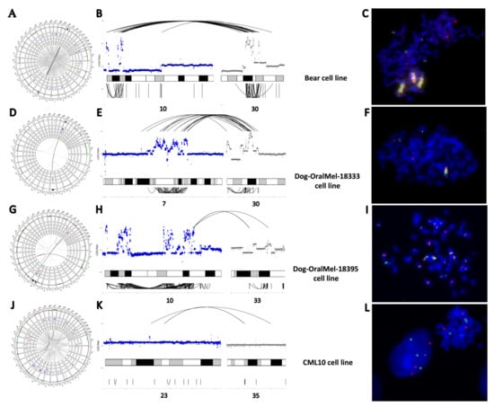 Structural variants (SVs) of the four canine MM cell lines. (A–C) SVs identified through WGS in the cell line Bear. (A). Circos plot representing the distribution of SVs along dog chromosomes with, from external to internal layers, CNA gains/losses (in dark red/green), deletions, duplications, insertions, and inversions in blue, light red, orange, and green, respectively. Interchromosomal break-ends (BND) are represented by gray lines connecting chromosomes with a color intensity corresponding to the number of reads validating the SV. (B). Focus on CFA 10 and CFA 30 present the focal amplifications and clusters of SVs (BND and INV). Copy numbers in log2ratio are represented as inter (top) and intra-chromosomal (bottom) SVs. (C). Fluorescence in situ hybridization (FISH) analysis of Bear cell line targeting CFA 10 (MDM2 region) and CFA 30 (TRPM7 region) in green and red, respectively, showing derivative chromosomes compatible with a chromothripsis-like event. (D–F). SVs of the cell line Dog-OralMel-18333. (D). Circos plot representing CNV, BND, DEL, and INV across the genome. (E). Focus on CFA 7 and CFA 30 presenting the focal amplifications and cluster of SVs (BND, DEL, DUP and INV). (F). FISH analysis of Dog-OralMel-18333 cell line targeting CFA 7 and CFA 30 (TRPM7 region) in green and red, respectively, showing derivative chromosomes compatible with a chromothripsis-like event. (G–I). SVs of the cell line Dog-OralMel-18395. (G). Circos plot representing CNV, BND, DEL, and INV across the genome. (H). Focus on CFA 10 and CFA 33 presenting the focal amplifications and cluster of SVs (BND, DEL, DUP, and INV). (I). FISH analysis of Dog-OralMel-18395 cell line targeting CFA 10 (MDM2 region) and CFA 10 (CDK4 region) in green and red, respectively, showing derivative chromosomes compatible with a chromothripsis-like event. (J–L). SVs of the cell line CML10. (J). Circos plot representing CNV, BND, DEL, and INV across the genome. (K). Focus on CFA 23 and CFA 35 presenting interchromosomal rearrangement. (L). FISH analysis of CML10 cell line targeting CFA 10 (MDM2 region) and CFA 30 (TRPM7 region) in green and red, respectively, showing 3 to 4 spots compatible with a tetraploid state without massive genomic rearrangements. Image (A,D,G,J) are available in the Supplementary Material (Figure A3, Figure A4, Figure A5 and Figure A6).
