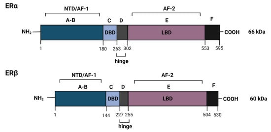 Structural organization of the α and β isoforms of the estrogen receptor (ER). The ER comprises six functional domains: A/B domains, N-terminal domain (NTD, containing activation function 1; C domain, the DNA-binding domain (DBD); D domain, hinge domain containing nuclear localization signals; E domain, ligand-binding domain (LBD) containing activation function 2; F domain, regulatory domain.