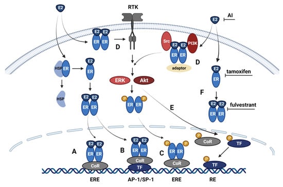 Mechanism of estrogen signaling and its inhibition by endocrine agents in breast cancer cells. (A) Classical genomic pathway. Estrogen (E2) upon binding to the estrogen receptor (ER), translocates to the nucleus, where it binds to estrogen response elements (EREs) within target genes. Coregulators (CoR) recruited to ER modulate gene expression. (B) Genomic, non-classical pathway. ER in the nucleus binds to target genes indirectly through interactions with transcription factors (TF). (C) Genomic, ligand-independent pathway. ER is activated by phosphorylation induced by kinases activated upon receptor tyrosine kinase (RTK)-mediated signaling. (D) Non-genomic, ligand pathway. Membrane-associated ER-bound with E2 activates RTKs and protein kinase cascades, which can also activate transcription factors modulating gene expression. (E) Convergence of non-genomic and genomic signaling. Activation of RTKs and protein kinases by ER-E2 complexes lead to the phosphorylation of ERs, coregulators, transcription factors regulating target gene transcription at multiple regulatory elements (RE). (F) Mechanism of endocrine agents. Aromatase inhibitors (AI) block estrogen production. Selective estrogen receptor modulators (SERMs), e.g., tamoxifen, competitively bind to ER, blocking the association with E2. Selective estrogen receptor modulators (SERDs), e.g., fulvestrant, inhibit ER dimerization. Created with BioRender.com (accessed on 5 December 2021).