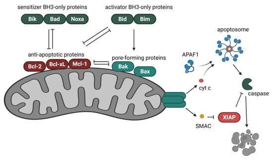 Bcl-2 family of proteins and their role in the intrinsic apoptotic pathway. The anti-apoptotic proteins (Bcl-2, Bcl-xL, Mcl-1) inhibit the activity of the pro-apoptotic proteins. The anti-apoptotic proteins are inhibited by sensitizer BH3-only proteins (Bik, Bad, Noxa) and activator BH3-only proteins (Bid, Bim). Activator BH3-only proteins, through binding to pore-forming proteins (Bax, Bak) induce their conformational change, oligomerization, and mitochondrial membrane permeabilization. This causes the release of cytochrome c, which associates with APAF1 to form the apoptosome activating procaspase-9. The apoptogenic factor SMAC released from the intermembrane space inhibits XIAP, an apoptosis inhibitor that binds caspases. Created with BioRender.com (accessed on 5 December 2021).
