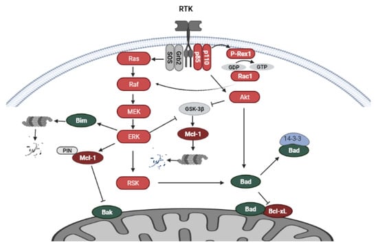 The regulation of Bcl-2 family proteins through PI3K/Akt and MAPK pathways in breast cancer cells. The BH3-only protein Bim is a target of ERK, which induces its phosphorylation leading to its proteasomal degradation. The activation of PI3K also leads to ERK-mediated Bim phosphorylation. This is facilitated through the guanine exchange factor for Rac1, P-Rex1, which induces Rac1/Raf/MEK/ERK/Bim signaling. Mcl-1 is a target of both ERK and Akt and is stabilized through the phosphorylation and inactivation of GSK3β. Additionally, ERK phosphorylates Mcl-1 enabling its stabilization by the isomerase Pin1 and inhibition of Bak. ERK and Akt also target the pro-apoptotic protein Bad. Phosphorylation of Bad recruits 14-3-3 proteins, which blocks its association with Bcl-xL at the mitochondria. Created with BioRender.com (accessed on 5 December 2021).