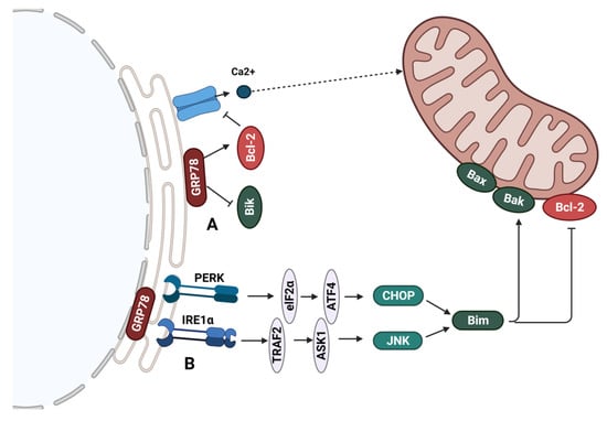 Regulation of apoptosis induction by Bcl-2 family proteins at the endoplasmic reticulum in endocrine-resistant breast cancer cells. (A) In the presence of high GRP78/BiP levels, Bik is sequestered by GRP78. Downregulation of GRP78 releases Bik, which binds Bcl-2 and blocks its antiapoptotic activity, enabling the release of Ca2+ from the ER and apoptosis induction at the mitochondria (B). In the presence of low levels of GRP78, induction of the UPR and activation of IRE1α and PERK leads to cell death. IRE1α activates JNK via the activation of TRAF2 and ASK1. JNK induces apoptosis through the upregulation of Bim, which can further activate Bax/Bak. PERK phosphorylates and inactivates elF2α resulting in the induction of ATF4 and CHOP, which has multiple downstream targets such as Bim. Created with BioRender.com (accessed on 5 December 2021).