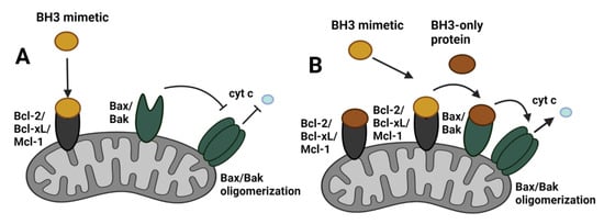 Priming of mitochondria for the activity of BH3 mimetics. (A) In the unprimed state, the low BH3-only protein load does not lead to apoptosis induction upon BH3 mimetic binding (B). In the primed state, high BH3-only protein load enables translocation of the BH3-only protein upon the binding of the BH3 mimetic, which leads to Bax/Bak activation, oligomerization, and cytochrome c release. Created with BioRender.com (accessed on 5 December 2021).