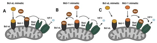 The compensatory role of Mcl-1 and Bcl-xL in resistance toward BH3 mimetics in ER+ breast cancer (A) The binding of the BH3 mimetic to Bcl-xL enables the translocation of Bim from Bcl-xL to Mcl-1, thus preventing the activation of Bak/Bax by Bim. (B) Binding of the Mcl-1 mimetic releases Bim, which binds to Bcl-xL. (C) The binding of both Bcl-xL and Mcl-1 with the corresponding BH3 mimetics enables the binding of Bim with pore-activating proteins Bax/Bak leading to their oligomerization and subsequent release of cytochrome c from the mitochondrial intermembrane space. Created with BioRender.com (accessed on 5 December 2021).