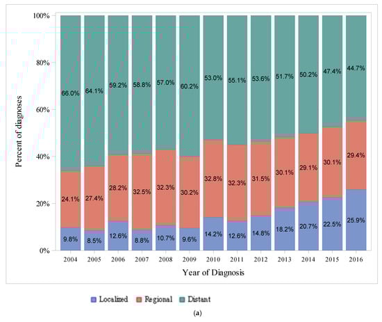 Figure 2a,b show trends in the percentage of diagnoses by stage at presentation and race/ethnicity, respectively. Diagnoses of distant-stage disease represented the highest percentage of diagnoses among all years in the study period, while localized-stage disease represented the lowest percentage of diagnoses among all years in the study period. The percentage of patients diagnosed with distant-stage disease decreased over time, from 66% in 2004 to 44.7% in 2016, whereas the percentage of patients diagnosed with localized-stage disease increased over time, from 9.8% of diagnoses in 2004 to 25.9% in 2016. The highest percentage of diagnoses was in Non-Hispanic White patients among all years in the study period, and the percentage of diagnoses in Non-Hispanic White patients decreased over time, from 60.4% in 2004 to 47.9% in 2016. The percentage of diagnoses in Non-Hispanic Black patients remained relatively constant over time, from 13.8% in 2004 to 15.8% in 2016. The percentage of diagnoses in Hispanic patients increased over time, from 15.4% in 2004 to 21.9% in 2016.
