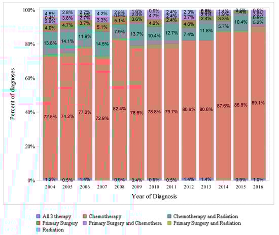Figure 3, Figure 4 and Figure 5 show the therapeutic modalities used to treat localized, regional, and distant-stage disease, respectively. For localized-stage disease, primary surgery alone was the most frequently utilized therapy modality among all years in the study period. For regional-stage disease, combined chemotherapy with radiation was the most frequently utilized therapy regimen from 2004–2010 (utilized in 38.6% of diagnoses in 2004 to 25.2% in 2010), whereas chemotherapy alone was the most frequently utilized therapy modality from 2011–2016 (utilized in 34.3% of diagnoses in 2011 to 49.0% in 2016). For distant-stage disease, chemotherapy alone was the most utilized therapy modality among all years in the study period and was utilized in an increasing percentage of diagnoses over time (from 78.3% in 2004 to 89.1% in 2016).