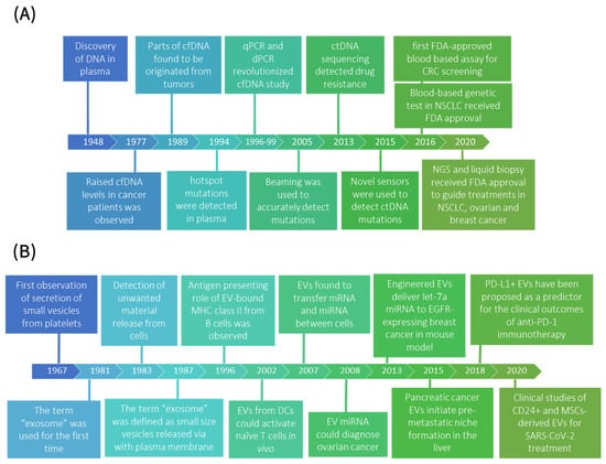 Timeline of significant discoveries related to (A) ctDNA [2,3,19,20,21,22,23,24,25,26,27,28] and (B) small EVs’ (exosomes’) [40,41,42,43,44,45,46,47,48,49,50,51,52,53,54,55] biology, to their clinical significance, and to technologies that have advanced their clinical utility.