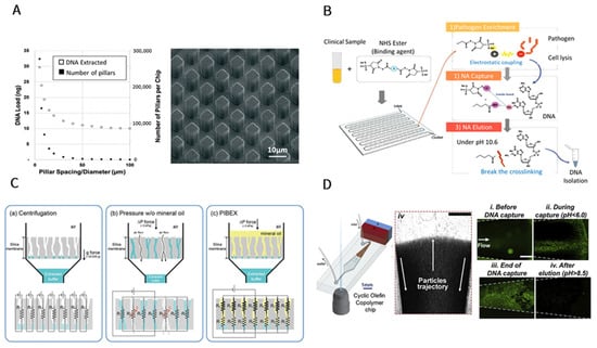 One major drawback of conventional SPE methods is their requirement for bulky associated instruments, such as vacuum pumps. To tackle this challenge, a microfluidic device that automates and facilitates delivery of the sample, which uses immiscible liquids such as mineral oil to improve liquid movements through silica membrane pores and enhances the DNA isolation process, is reported. The results showed that the recovery rate of DNA using this technique increased by about 5% (Figure 3C) [88].