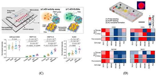 With the improvement in oncology-related diagnosis, imaging, and drug discovery technologies and platforms, large data sets are being generated. These data can be categorized into different genomic, proteomic, and radiomic subcategories. Artificial intelligence, including machine learning (ML) and deep learning (DL) methods, have been implemented for various applications including biomarker discovery, and digital pathology (review [187,188,189,190,191]). In the case of cancer biomarkers, DL approaches have been utilized to detect ctDNA markers in cancer cases [192,193]. Additionally, ML algorithms have the potential of validating EV markers for cancer diagnosis considering various EV-contents such as long RNAs in pancreatic ductal adenocarcinoma [194], or wide-ranging arrays of novel proteins other than pan-EV proteins in multiple cancers [195]. The integration of ML/DL algorithms with microfluidic devices can be leveraged to develop platforms with higher diagnosis value. The exosome track-etched magnetic nanopore (ExoTENPO) chip is formed of membranes coated with a magnetic layer, and with nanopores with a size of 600 nm (Figure 7C) [196]. Following the immunomagnetic isolation of pancreatic cancer sEVs (from KPCY mice) with the ExoTENPO chip, they were lysed on-chip, and qPCR data of EVs’ mRNA contents were analyzed for an array of eight genes including ARG1, CD63, CK18, Erbb3, GAPDH, KRAS, and ODC1. Based on an ML algorithm, linear discriminant analysis (LDA), the data can be used to subcategorize samples into healthy, pancreatic intra-epithelial neoplasia lesion, and cancer cases. This classification was also verified for clinical sample. To demonstrate the ability of this device and the classification of their ML algorithm, the same research group analyzed EV-miRNA signatures to diagnose pancreatic cancer [197]. In another study, a microdevice was designed to isolate sEVs with different sizes, namely, exosomes, microvesicles, and apoptotic bodies [198]. The isolation could occur with the help of a viscoelastic fluid and Newtonian sheath flow within the device (Figure 7D). With a different approach from previous studies, the authors studied two markers, HER2 and EpCAM, in sEVs with different sizes to check if different subtypes of sEVs could have a different diagnostic ability. A similar ML approach was developed to classify the data from cell lines as well as clinical ones from cohort of stage II breast cancer patients. The results suggest microvesicles can be a better LB biomarker since they tend to show better scores for LDA and t-distributed stochastic neighbor embedding analysis.