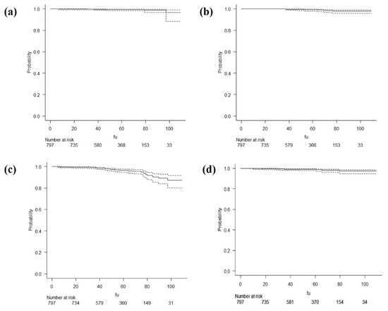 Kaplan-Meier curves for in-field Local Control (a), out-field Local Control (b), Disease Free Survival (c) and Overall Survival (d). The dashed lines represent 95% confidence interval in each curve. X axis represents the probability of the event and Y axis the variable time to the event.