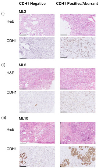 Representative samples of E-cadherin staining. Micrographs of representative hematoxylin and eosin (H&E) stained sections and E-cadherin immunohistochemistry (IHC) of three selected E-cadherin heterogeneous breast cancers included in this study (scale bar IHC, 200 μm). (i) ML3 CDH1MT, (ii) ML6 CDH1WT and (iii) ML10 CDH1WT. Note in ML10, the aberrant component is DCIS.
