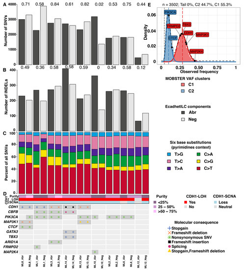 Summary of mutational analysis. (A) Bar plot of number of SNVs for each component of patient samples. (B) Bar plot of indels for each component of patient samples. (C) Proportion of SNVs split into six classes in pyrimidines context. (D) Heatmap of recurrently altered breast cancer genes [6] with at least one mutation found in our study. Numbers on bar plots show overlap coefficient of SNVs (A) and indels (B) between paired patient samples. Note that ML6_Abr has a ploidy estimate of 4, so is copy neutral with LOH of the CDH1 locus. (E) MOBSTER-inferred clonal clusters of ML8_Neg showing two distinct VAF-derived distributions.
