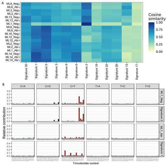Inference of trinucleotide single-base substitutions signatures was performed, using the R (v4.1.0) package MutationalPatterns (v3.2.0). Representative single-base substitution signature profiles were downloaded from the COSMIC database: http://cancer.sanger.ac.uk/cancergenome/assets/signatures_probabilities.txt (accessed on 22 October 2021).