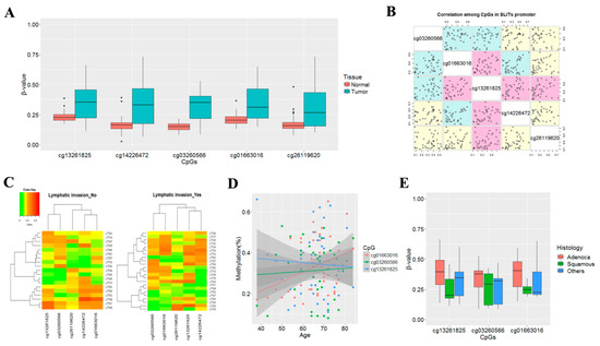 Relationship between aberrant methylation of SLIT genes and clinicopathological features in 42 patients with NSCLC. (A) Methylation levels of five CpGs at the CpG island regions of SLIT1, SLIT2, and SLIT3 genes were compared between tumor and matched normal tissues from 42 NSCLC patients. Y-axis indicates β-value. (B) Correlation among methylation levels of five CpGs was analyzed for 42 tumor tissues using Spearman’s correlation coefficients. Magenta color indicates p < 0.05. (C–E) Methylation levels of CpGs at SLIT1, SLIT2 and SLIT3 genes were compared according to lymphatic invasion (C), age (D), and histologic subtypes (E).