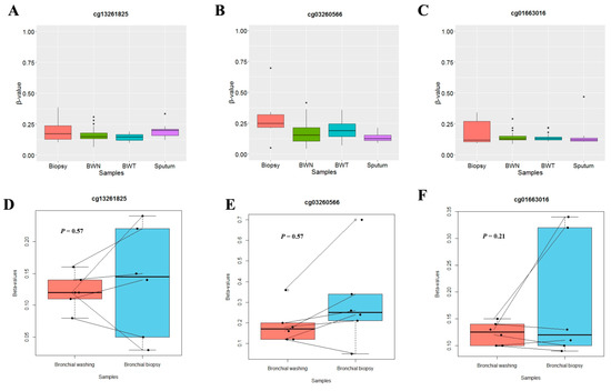 Methylation levels of three CpGs (cg13261825, cg03260566, and cg01663016) were analyzed in 136 bronchial washings (76 NSCLC patients and 60 cancer-free patients), 12 sputum samples and six bronchial biopsy specimens from NSCLC patients to test if those specimens could be used as surrogate samples for assessing aberrant methylation of SLIT genes observed in lung tumor tissues. Methylation levels of these three CpGs (Figure 2A–C) in bronchial biopsy, bronchial washing and sputum specimens were significantly lower than those in tumor tissues shown in Figure 1A, but similar to those in normal tissues. In addition, methylation levels of these CpGs in bronchial biopsy samples from NSCLC patients were not significantly different from those in 6 paired bronchial washing samples (p > 0.05, Wilcoxon signed-rank test; Figure 2D–F). Based on these observations, sputum, bronchial washing and bronchial biopsy specimens might not be feasible as surrogates for analyzing aberrant methylation of SLIT genes in lung tumor tissues.