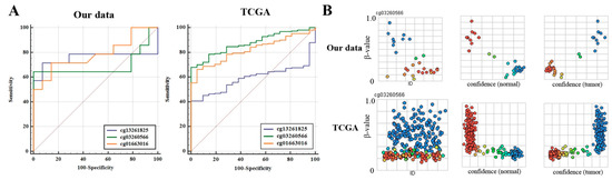 Evaluation of prediction performance of a model in our data and TCGA lung cancer data. (A) Prediction performance of a logistic regression model based on three CpGs was evaluated in our data (left) and TCGA (right) test dataset. ROC curves were plotted using the MedCalc software. (B) Prediction certainty of a logistic regression model based on cg03260566 was estimated in a test dataset. Y-axis indicates β-value. “ID” in the left panel represents identification number of test samples. In the middle and right panels, the X-axis indicates confidence (normal or tumor) that predicts samples as normal (middle panel) or tumor (right panel) for each β-value on the Y-axis. The sky blue and red orange circles indicate high and low confidence, respectively.