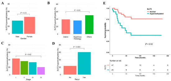 Clinicopathological significance of SLIT2 hypermethylation was analyzed in plasma cell-free DNA from 72 NSCLC patients. SLIT2 was defined as hypermethylated when β-value was greater than or equal to 0.15. SLIT2 hypermethylation was found in 24 (33%) of 72 NSCLCs. SLIT2 hypermethylation was not significantly different according to gender (Figure 5A), histology (Figure 5B), or pathologic stage (Figure 5C). In addition, SLIT2 hypermethylation was not associated with age, smoking status, tumor size, lymphatic invasion, vascular invasion or neural invasion. However, SLIT2 hypermethylation was significantly associated with tumor recurrence (Figure 5D). The median follow-up period of patients was 5.2 years. Patients with SLIT2 hypermethylation showed poor recurrence-free survival (RFS) compared to those without (Figure 5E). Five-year recurrence-free survival rates of patients with and without SLIT2 hypermethylation were 44% and 80%, respectively. Cox proportional hazards analysis showed that RFS of patients with SLIT2 hypermethylation was 2.19 times (95% CI = 1.21–4.36; p = 0.01) poorer than in those without after adjusting for age and pathologic stage (Table 1).