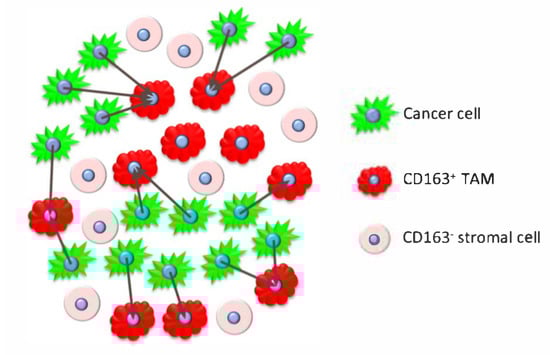 Moreover, our results indicate that the average number of communicating CD TAMs is a potentially more informative metric than the traditional density of CD TAMs within a sampled area of the tumor. Similarly, all NND-based metrics and the average number of adjacent CD TAMs can be used in tumor images of any size and can also be computed for other immune cell populations and can be applied to other solid tumor types. Although we focused on the analysis of breast cancer data, higher CD TAM density has been shown to be correlated with worse prognosis in other cancer subtypes such as cutaneous melanoma [57], colorectal carcinoma [58,59], and ovarian carcinoma [60]. These studies primarily focused on the density of TAMs rather than spatial arrangements of TAMs. However, some studies showed that increased CD TAM prevalence was associated with improved clinical outcomes in colorectal carcinoma [61,62]. Thus, as pointed out by Krijgsman et al. [63], it is critical to characterize the spatial distribution of TAMs in order to fully understand the association between TAMs and clinical outcomes.