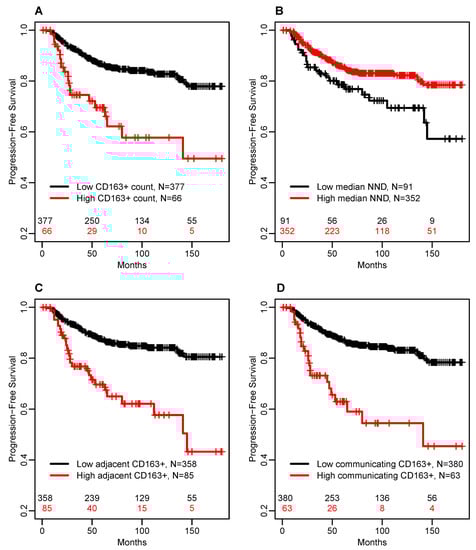 Kaplan–Meier plots of PFS by CD163-related markers with the highest prognostic value in the multivariable Cox model adjusted for significant clinicopathologic risk factors. (A) total number of CD TAMs in the sampled tumor area (CD Count); (B) median nearest neighbor distance (median NND) from cancer cells to CD TAMs; (C) the average number of CD TAMs within 12 μm distance of each cancer cell (adjacent CD); (D) the average number of CD TAMs within 250 μm distance of each cancer cell (communicating CD).