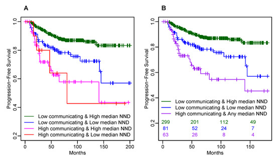 Kaplan–Meier plots of PFS by combined CD TAM marker based on high vs. low average number of communicating CD cells and high vs. low median NND. (A) by four combinations of low/high average number of communicating CD cells and low/high median cancer-to-CD NND; (B) by combined CD163 marker with 3 categories: (1) low average number of communicating CD cells and high median cancer-to-CD NND; (2) low average number of communicating CD cells and low median cancer-to-CD NND; (3) high average number of communicating CD cells and any median cancer-to-CD NND.