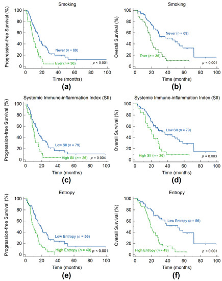 Kaplan–Meier estimates of progression-free survival and overall survival according to the patient smoking status (a,b), systemic inflammation index (c,d), and tumor entropy (e,f).