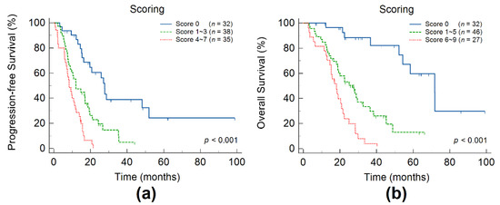 Kaplan–Meier estimates of progression-free survival (a) and overall survival (b) according to the prognostic scoring model.